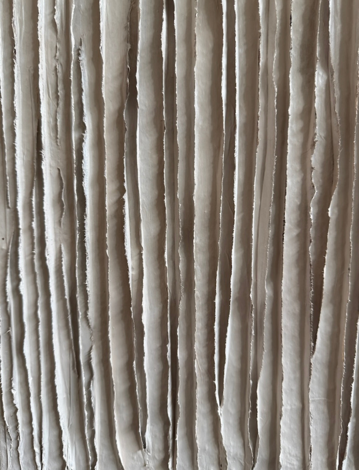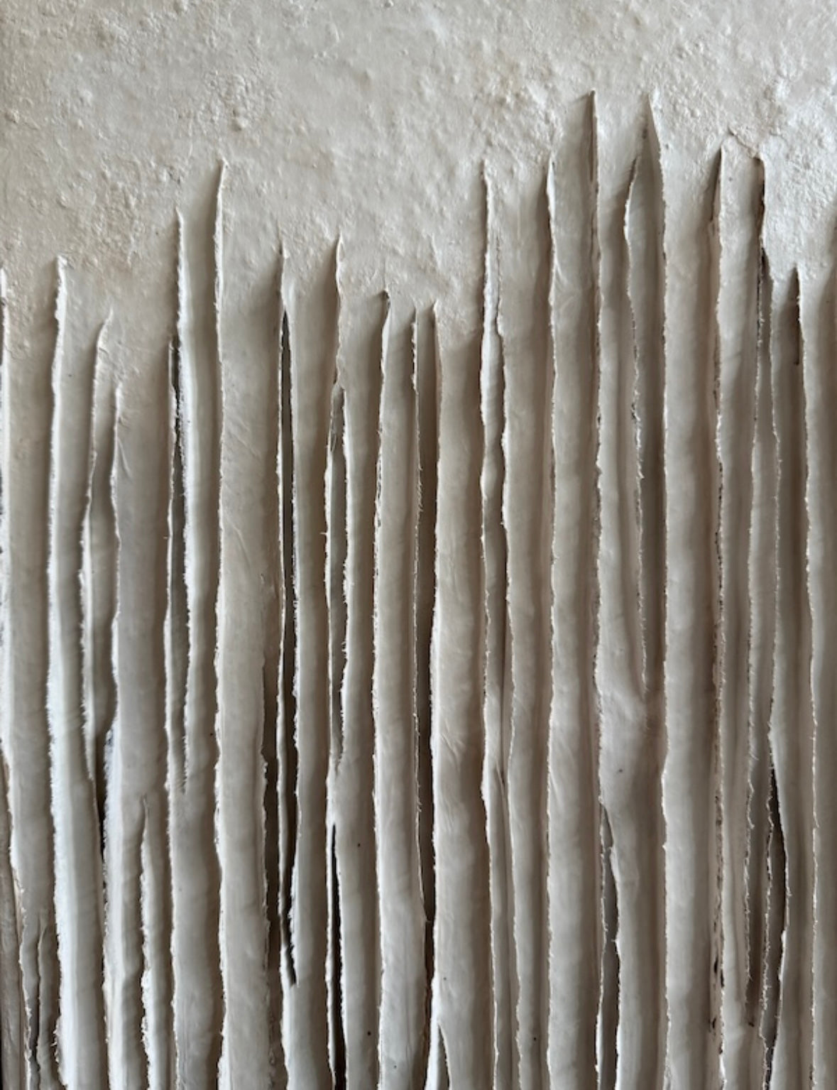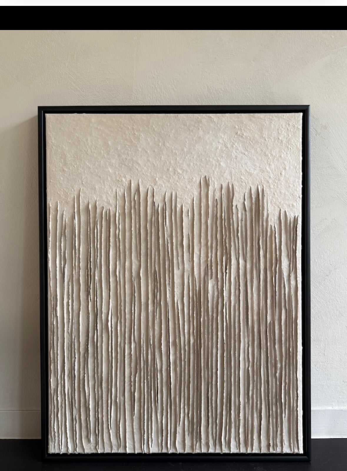 Mixed media: acrylics, divers rijst papier, porselein gips en cement op linnen canvas.