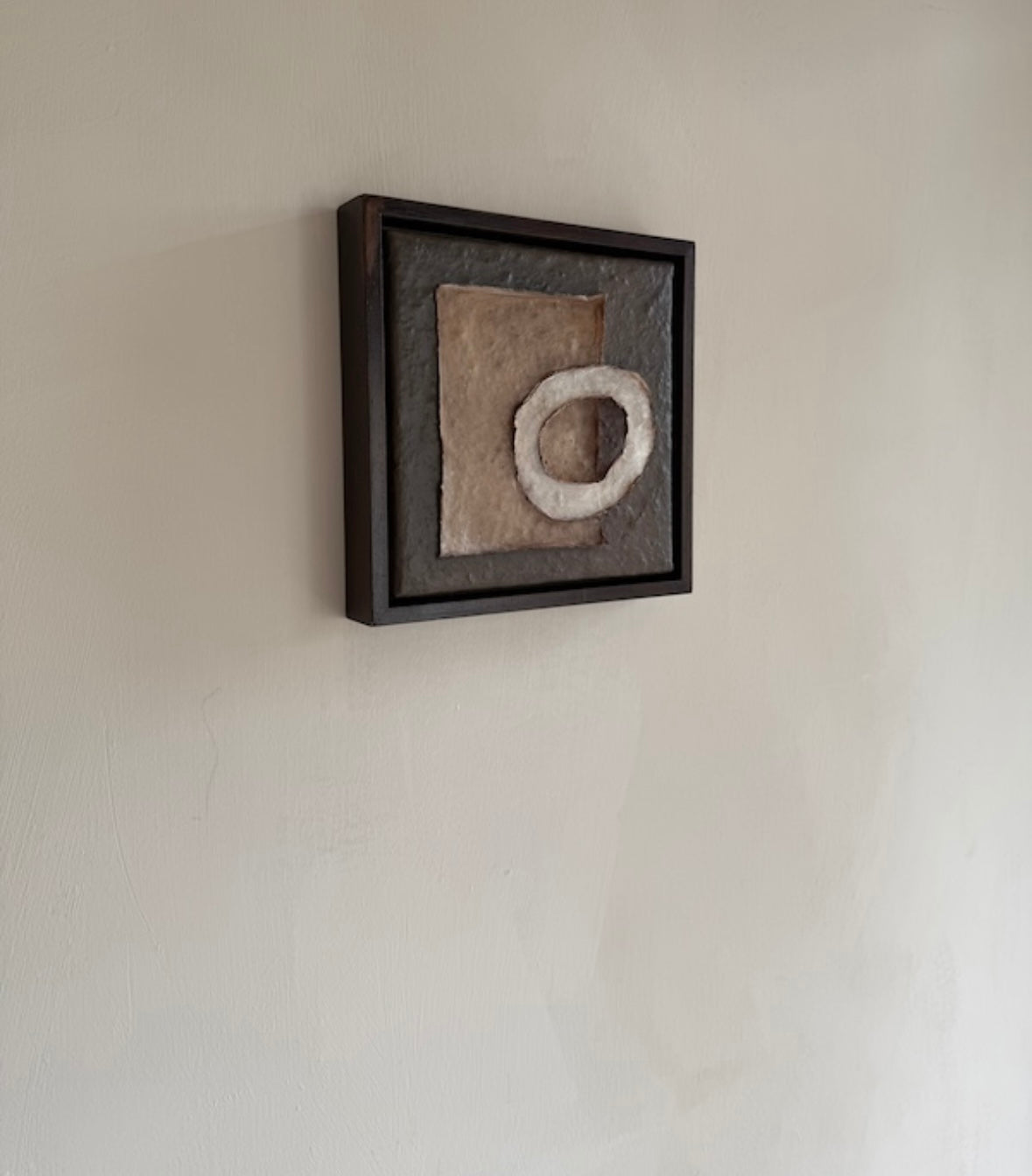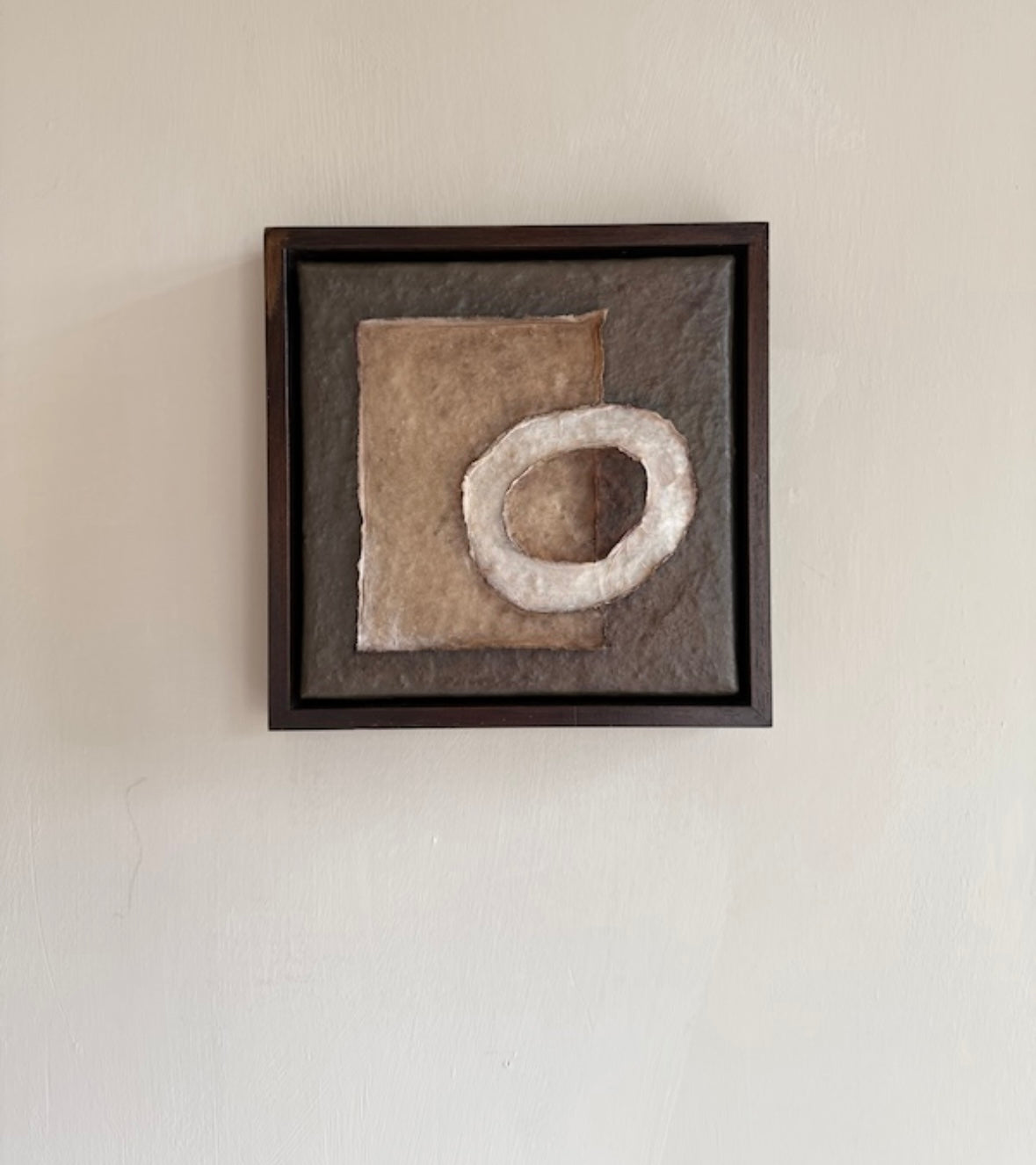 Mixed media: acrylics, rijst papier, cement, porselein gips op linnen canvas.