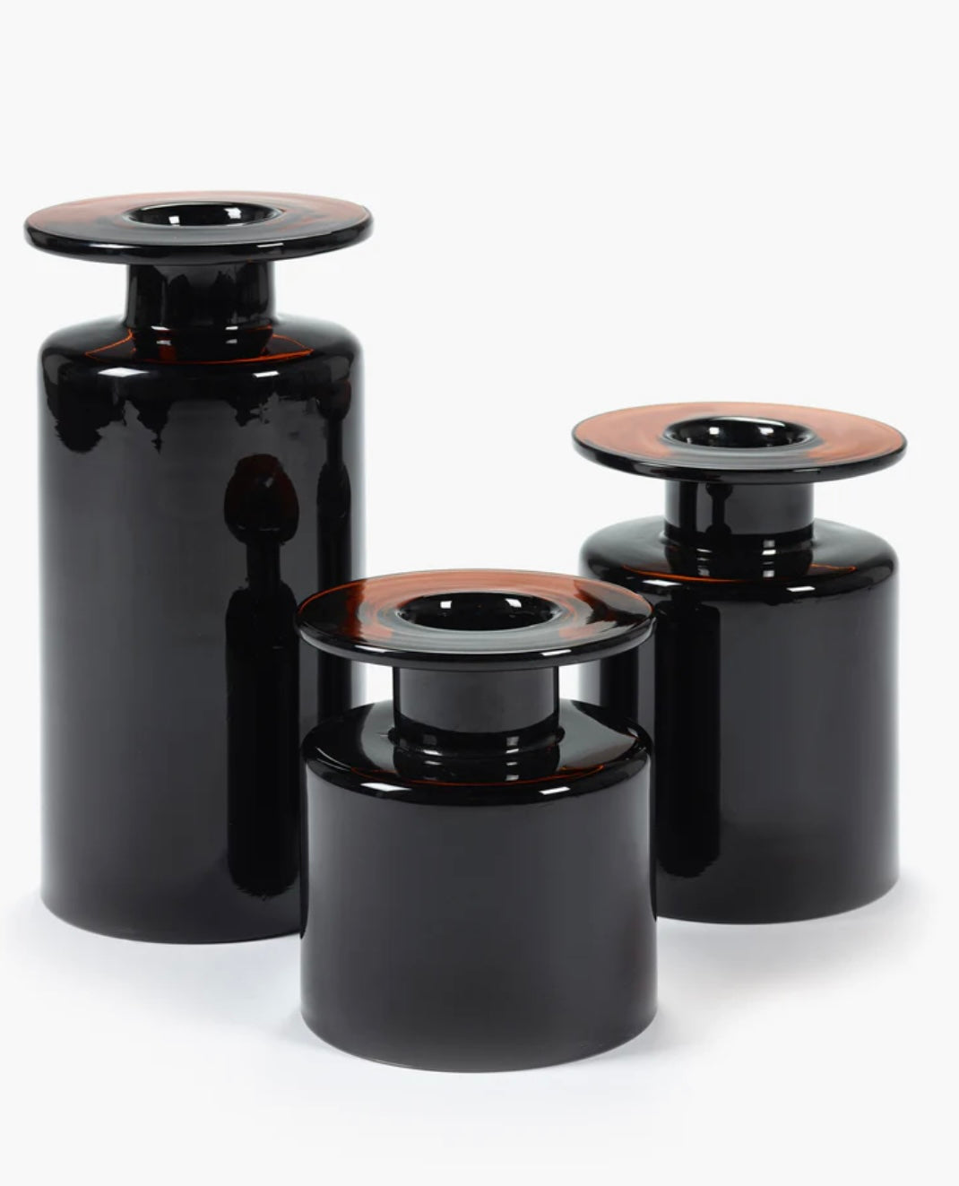 Deze vintage-geïnspireerde vaas in zwart/donkerbruine kleur geeft een vleugje nostalgie aan je interieur. De vaas is onderdeel van de Wind & Fire collectie van Marie Michielssen en is verkrijgbaar in verschillende maten. Combineer het met andere vazen en glaswerk uit dezelfde collectie voor een speels effect.
